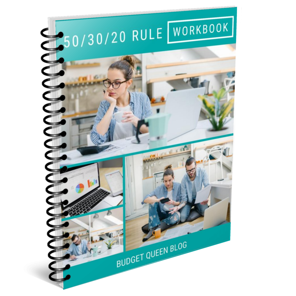 Get my 50/30/20 Rule Workbook where I explain the rule and help you create your budget with this easy to use and simple plan.